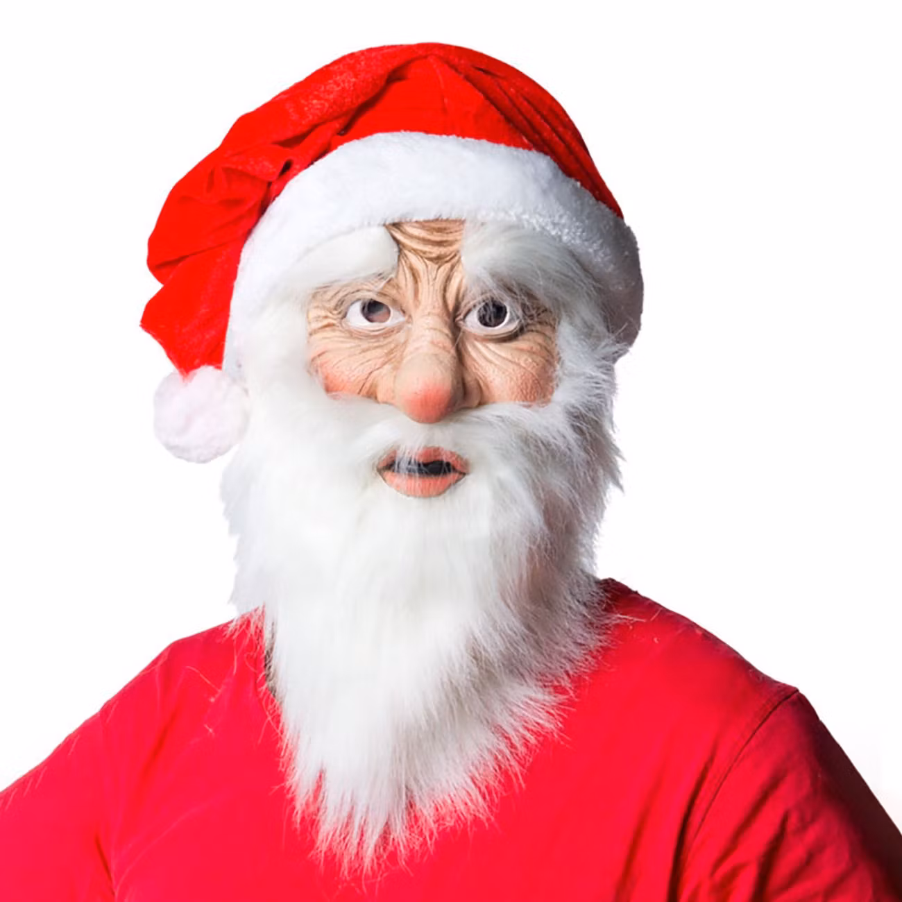 Med denna välgjorda Tomtemask Deluxe får du inte bara en verklighetstrogen mask i gummi med ögon, röd näsa, läppar och allt. Med på köpet får du även det lurviga skägget och den finfina tomteluvan som båda sitter ihop med masken.
