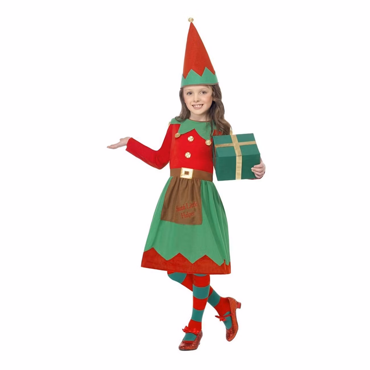 Tomtenisse Barn Maskeraddräkt innehåller klänning och hatt i polyester. Finns i storlekarna Small (4-6 år), Medium (7-9 år), Large (10-12 år). Övriga kläder och julklapp medföljer ej.