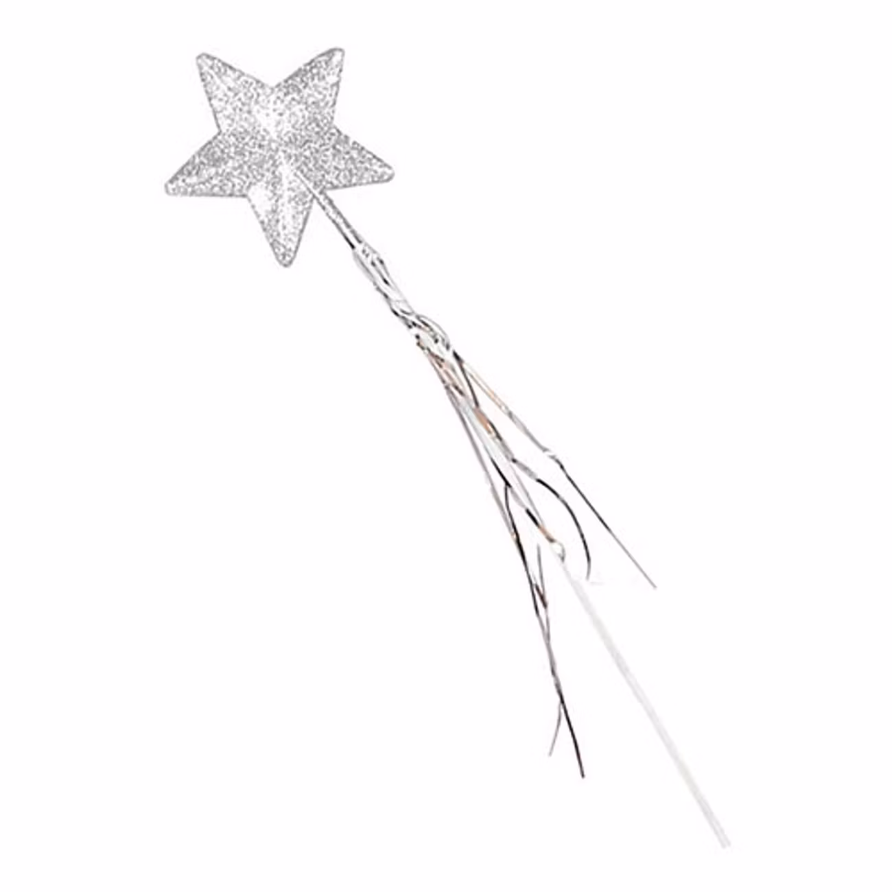 Trollstav Stjärna Silver Glittrande är en silverfärgad skimrande stjärna med silverfärgade foliestrimlor på en vit plastpinne. Den är tillverkad i plast och är 40 cm lång.
