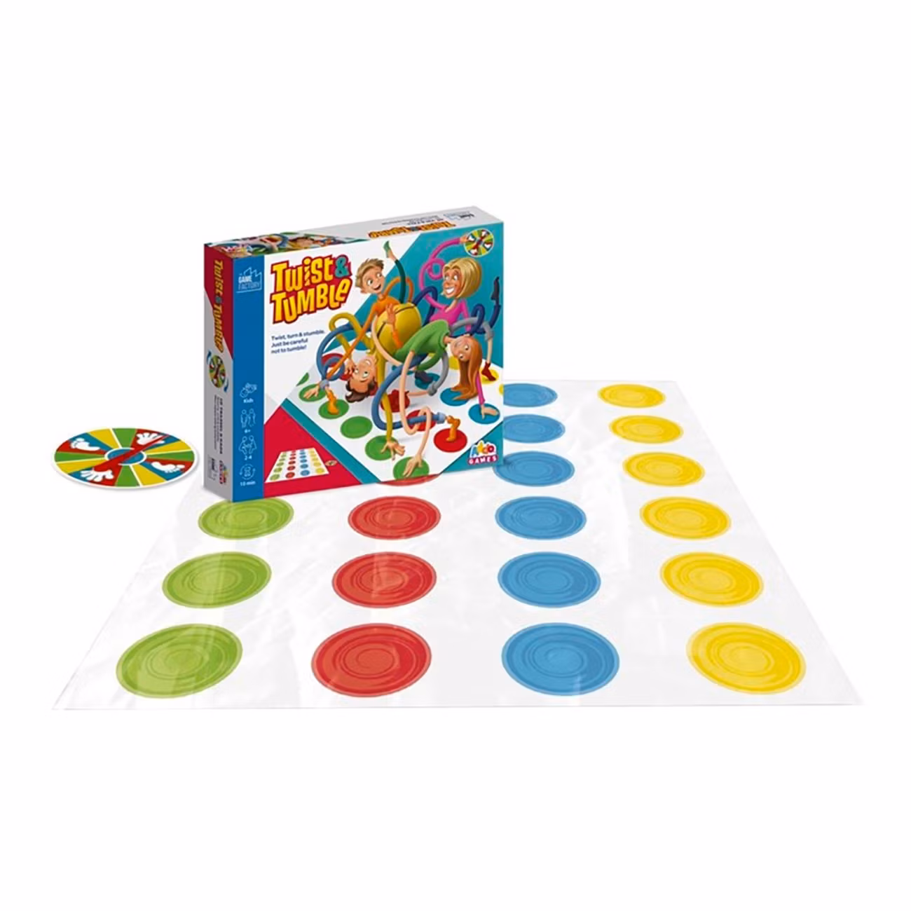 Twist & Tumble Spel är ett enkelt och roligt spel som passar både vuxna och barn. Rulla ut mattan och snurra på pilen. Förflytta sedan händer och fötter så som pilen visar. Den som tappar balansen förlorar.