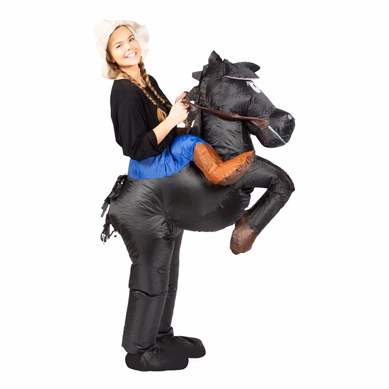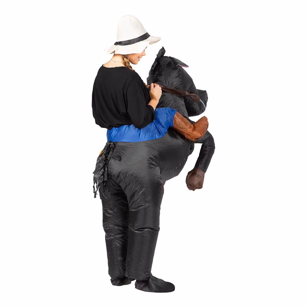 Uppblåsbar Ridande Häst Svart Maskeraddräkt är en riktigt rolig maskeraddräkt som får det att se ut som om du rider på en stor svart häst. Dräkten är uppblåsbar och drivs via en batteridriven fläkt bak som blåser upp dräkten konstant under kvällen. Batterifläkten sitter placerad diskret på baksidan av dräkten och drivs via 4 x AA-batterier (medföljer ej).