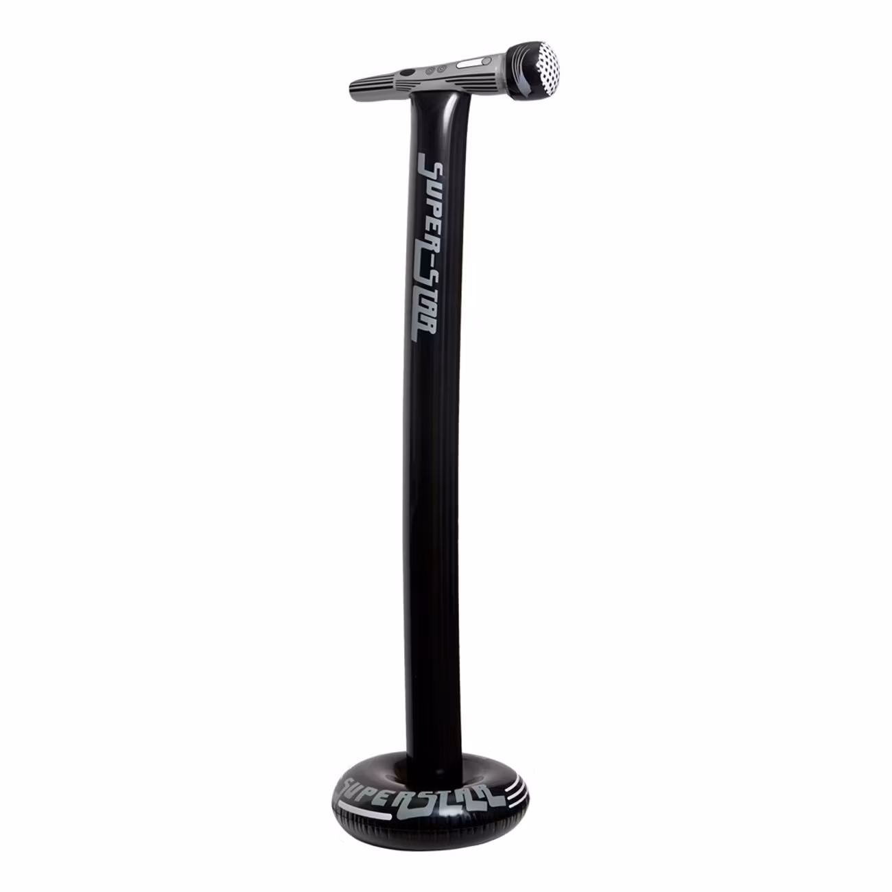 Uppblåsbart Mikrofonstativ är ett mikrofonstativ med mikrofon i uppblåsbart format. Stativet och mikrofonen är svarta med grå detaljer och mitt på stativet samt på foten finns texten "Super Star" i grått.