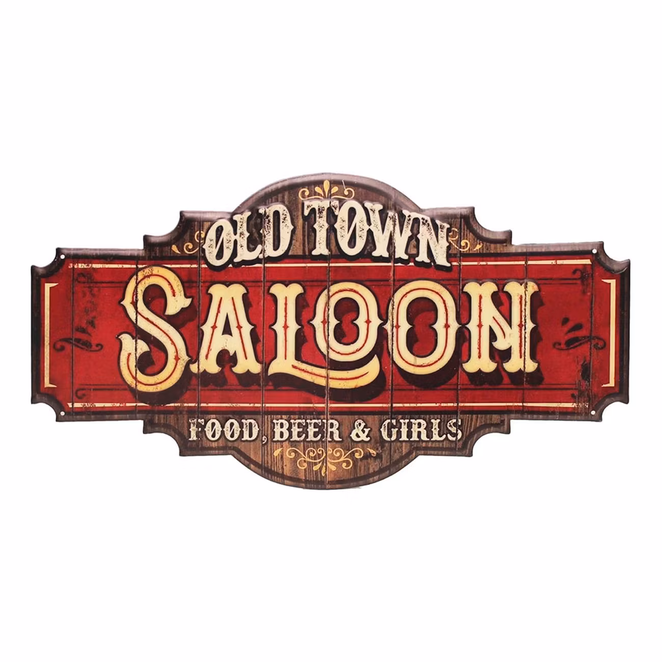 Väggdekoration Saloon är en barskylt som kommer med texten "Old Town Saloon – Food Beer & Girls". En klockren dekoration att hänga på väggen till maskeraden med Cowboy/Vilda västern-tema, alternativt till grillfesten.