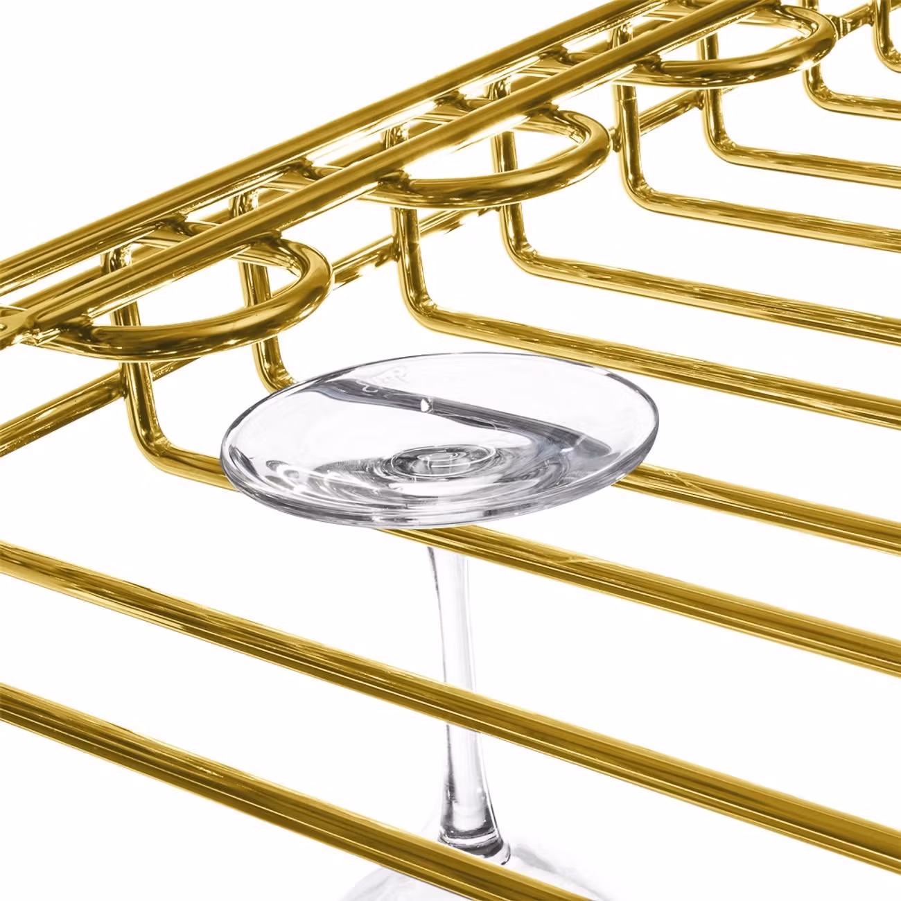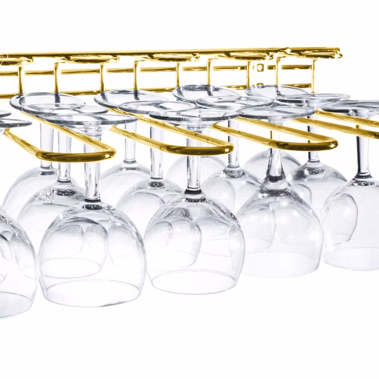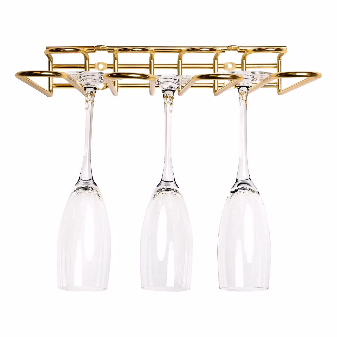Väggmonterat Vinglasrack Guld är en snygg ställning för dina vinglas! Fäst den under en hylla eller direkt på väggen för att få en snygg look i ditt hem. Välj mellan tre eller fem sektioner.