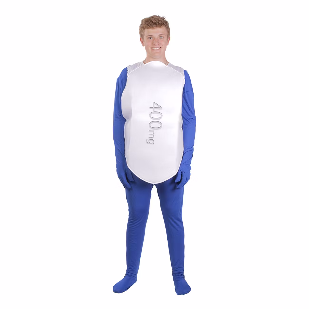Värktabletts-Mannen Maskeraddräkt inkluderar en blå bodysuit och ett vitt förkläde som har formen av en värktablett. På framsidan av den vita delen står det 400 mg med svagt grå ton. Komplettera ditt köp med en minigitarr för en komplett outfit.