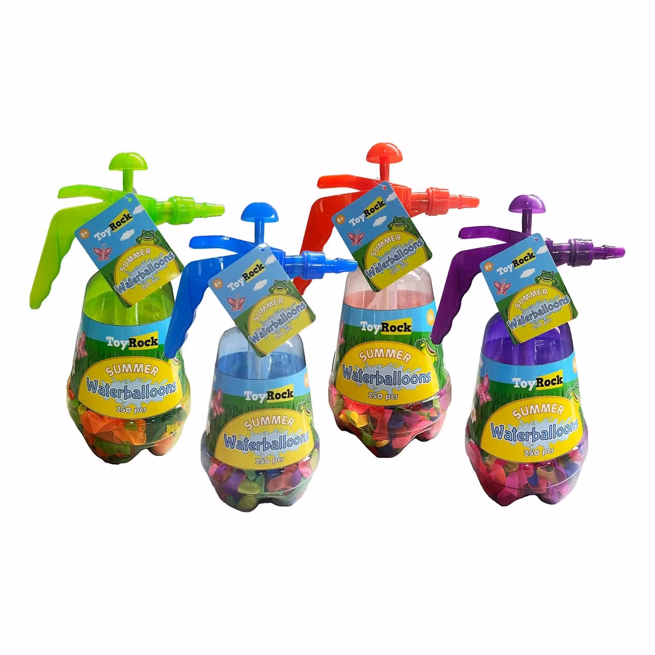 Vattenballonger med Pump består av ett stycke pump tillsammans med 250 stycken vattenballonger. Pumpen levereras osorterat vilket betyder att färgen på pumpen kan variera mellan grön, blå och röd, lila. Det enda du behöver göra är att fylla med vatten, knyta – färdig!