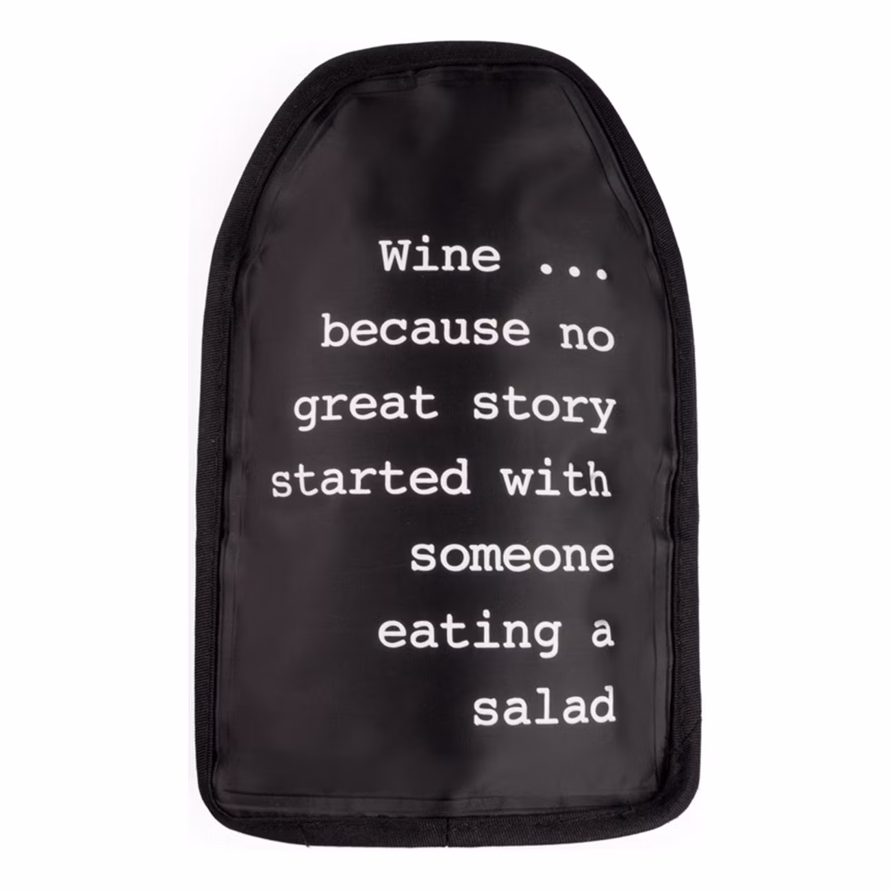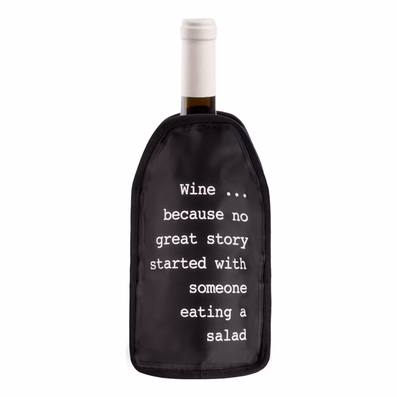 Vinkylare Great Story är en svart påse med texten "Wine... because no great story started with someone eating a salad". Humoristisk text på en smart produkt utgör en fantastisk present till någon som ofta är på språng med vinflaskan. Mer kylt vin åt folket!