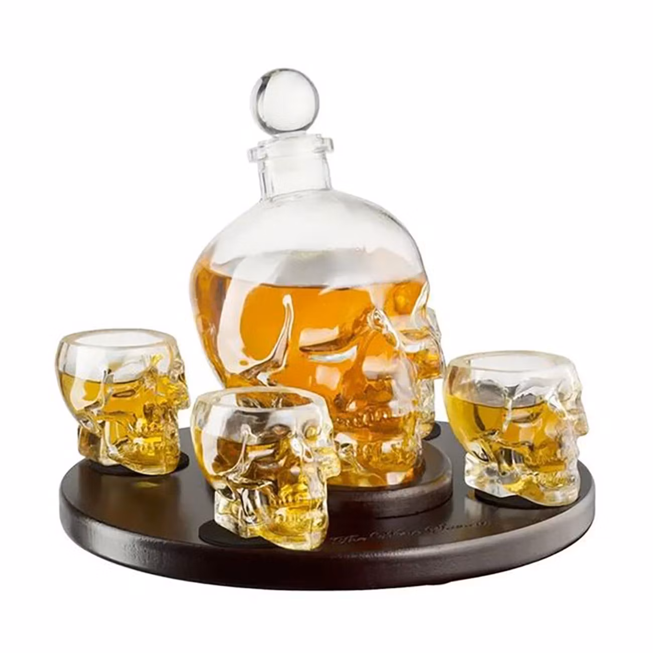 Dödskalle Karaff Set består av ett exklusivt set med fyra whiskyglas och en karaff. Karaffen är formad som en stor dödskalle och kommer med en snygg cylinderformad kork. Glasen är även de formade som dödskallar. Det medföljer även en mörkbrun bricka i trä som går att snurra på. Luta dig nu tillbaka i lädersoffan och njut!