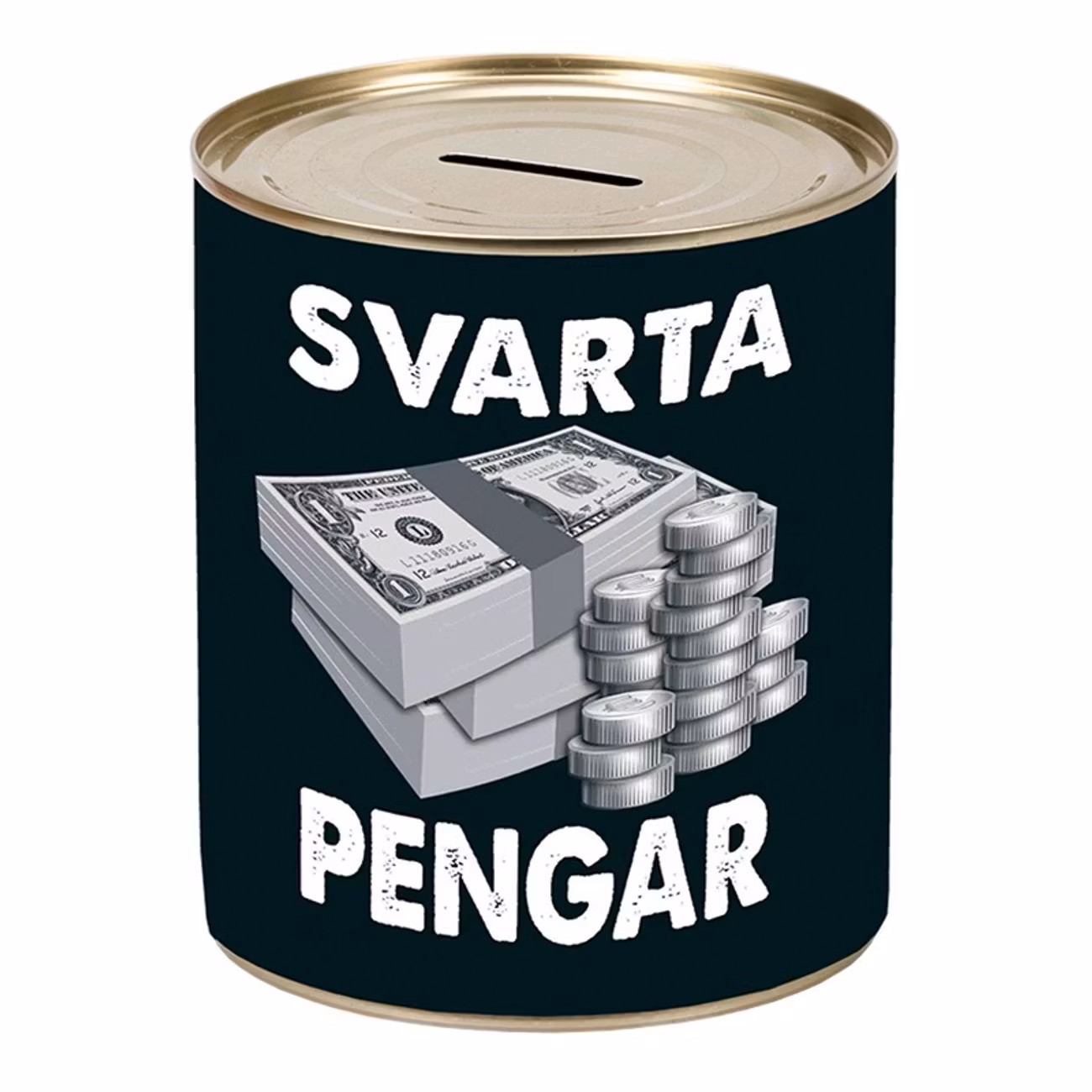 Plåtsparbössa Svarta Pengar är en svart sparbössa i plåt. På sparbössan finns en bild på sedlar och mynt och runt bilden står det "Svarta pengar". Sparbössan är 11,5 cm hög, 10 cm bred och den väger 0,094 kg.