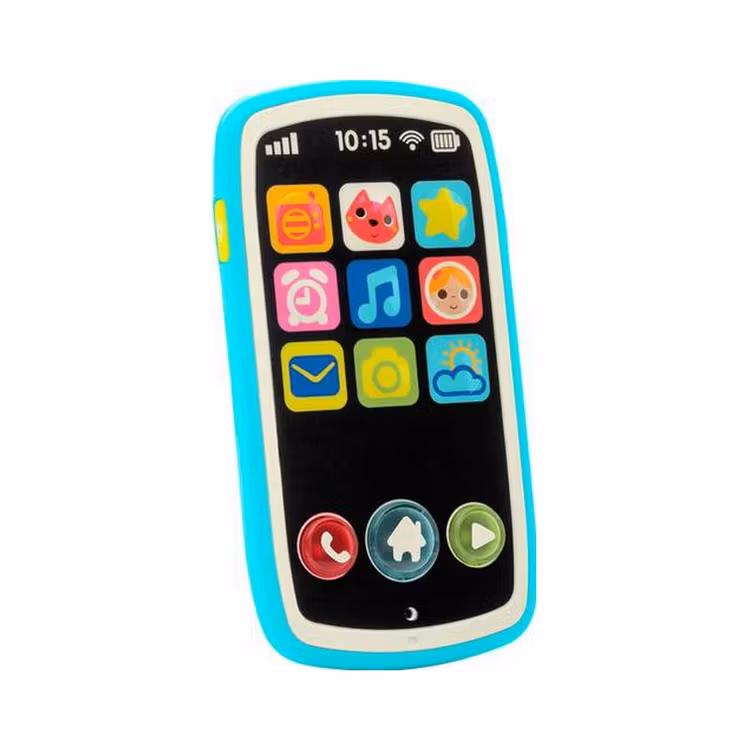 Elektroniskt plastspel. 12 knappar, var och en spelar olika musik när du trycker på dem. Knapparna visar: en radio, en katt, en stjärna, en väckarklocka, en anteckning, ett barn, ett kuvert, en kamera och ett moln med en sol. 1 på / av-knapp. 1 inspelare för inspelning (tryck "spela" för att höra inspelningen). För att spela in, tryck på knappen på sidan av telefonen och spela upp genom att trycka på den röda knappen längst ner till höger.