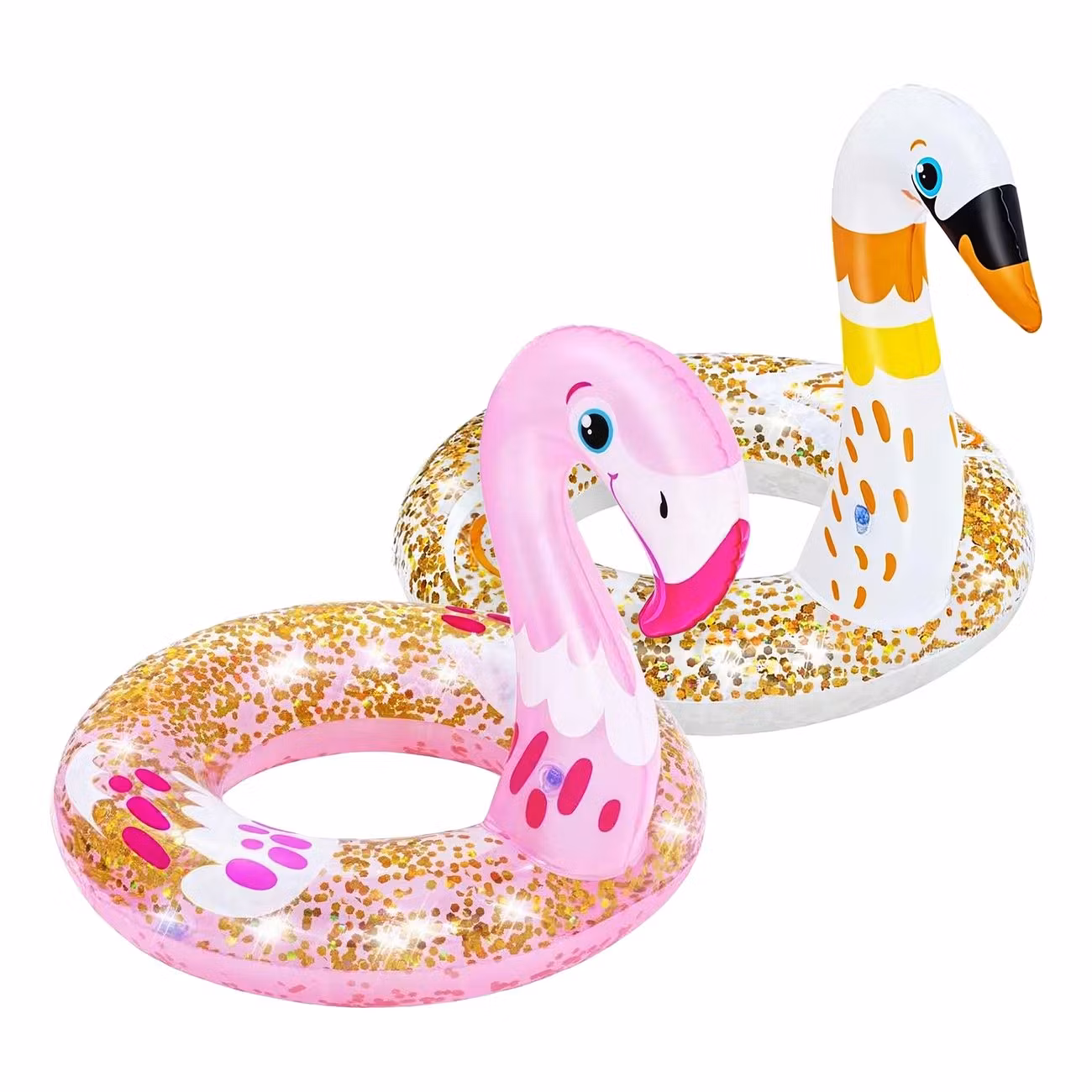 Badring Svan/Flamingo är en uppblåsbar, glittrande flytleksak som kommer föreställande antingen en vit svan eller en rosa flamingo. Badringen passar barn mellan 3 till 6 år.