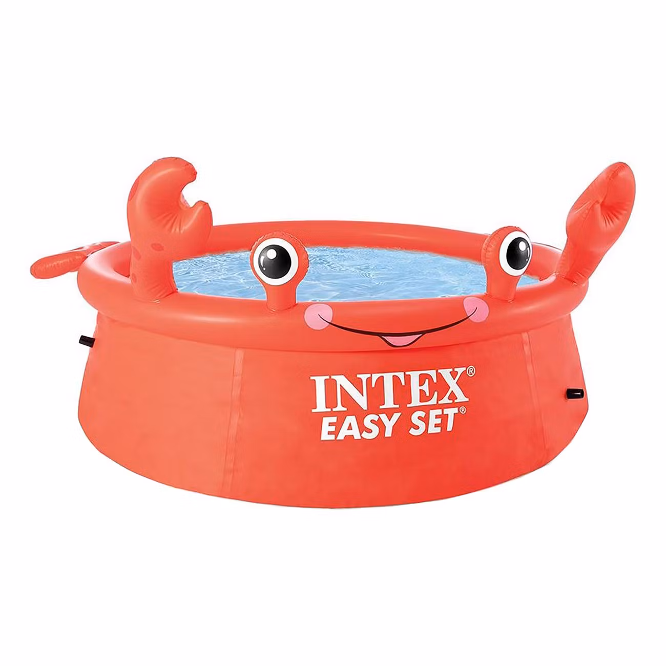 Intex Easy Set Uppblåsbar Pool Krabba är en uppblåsbar bassäng som är delvis formad som en röd krabba och kommer en storlek som är lämplig för barn. Monteringen av poolen tar endast cirka 10 minuter: Lägg ut den på ett plant underlag, blås upp och fyll med vatten. Voila!