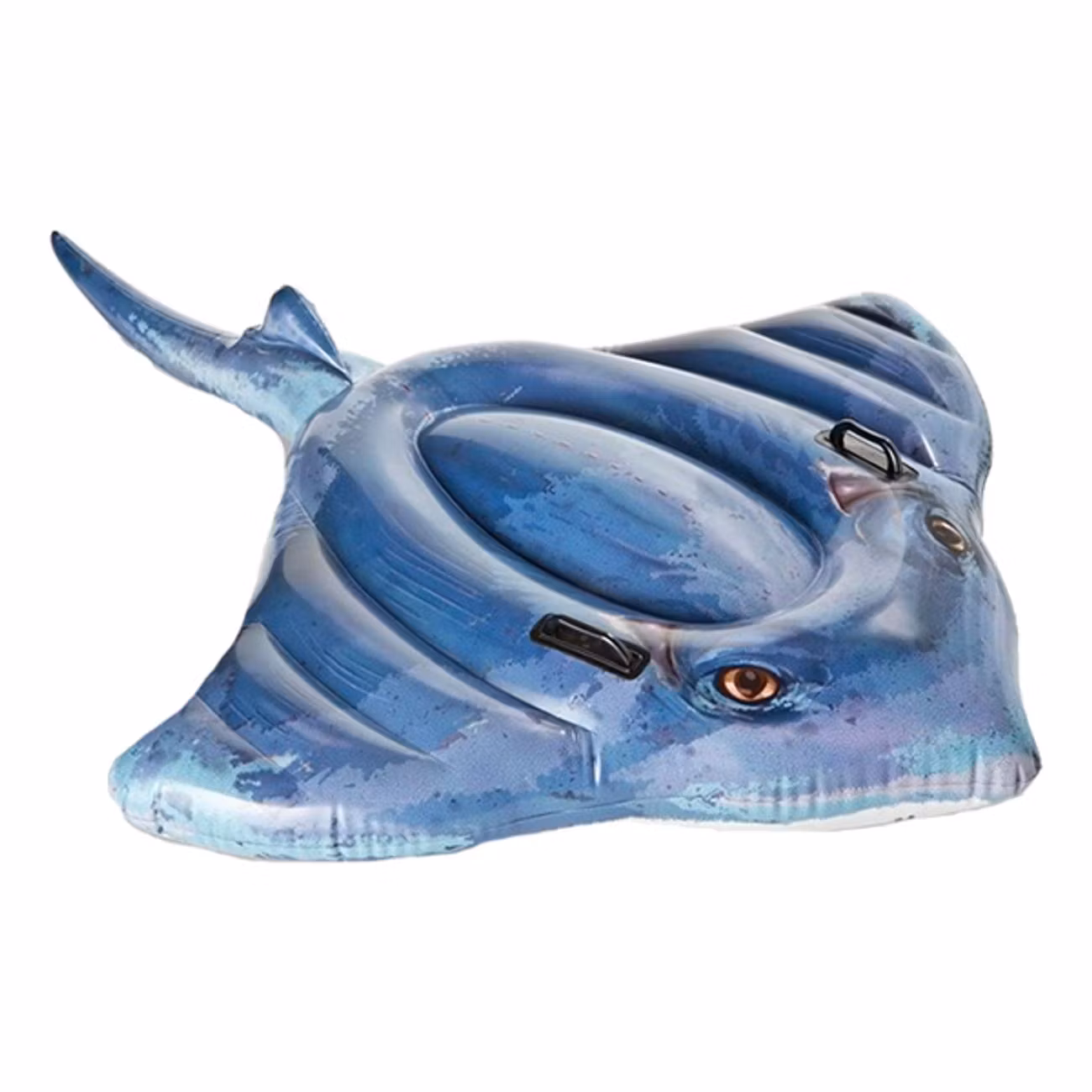 Intex Stingrocka Badmadrass innehåller en fotorealistisk badmadrass som är utformad som en stingrocka. Madrassen mäter 188 x 145 cm och är tillverkad av plast. Maxvikten är 40 kg. Från 3 år. Kräver tillsyn av en vuxen person.