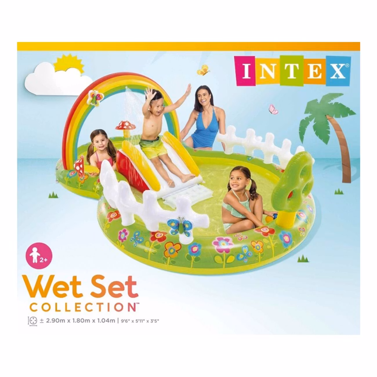 Intex Uppblåsbar Vattenpark mäter 290 x 180 x 104 cm och rymmer hela 450 liter. När du ansluter trädgårdsslangen i poolen sprutar det vatten från regnbågen. Perfekt present till badsugna barn! Från 3+ (tillsyn från vuxen krävs alltid).