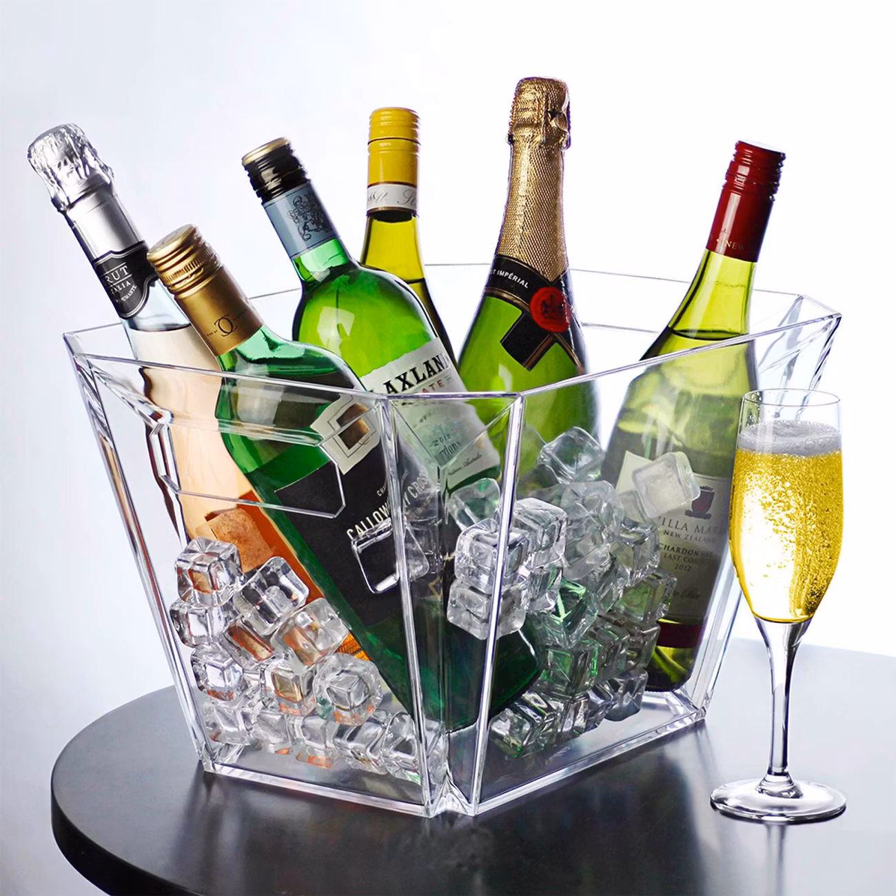 Ishink i Akryl Rektangulär är en transparent skål med handtag på kortsidorna för enkel servering. Flaskorna som syns på bilden ingår inte.