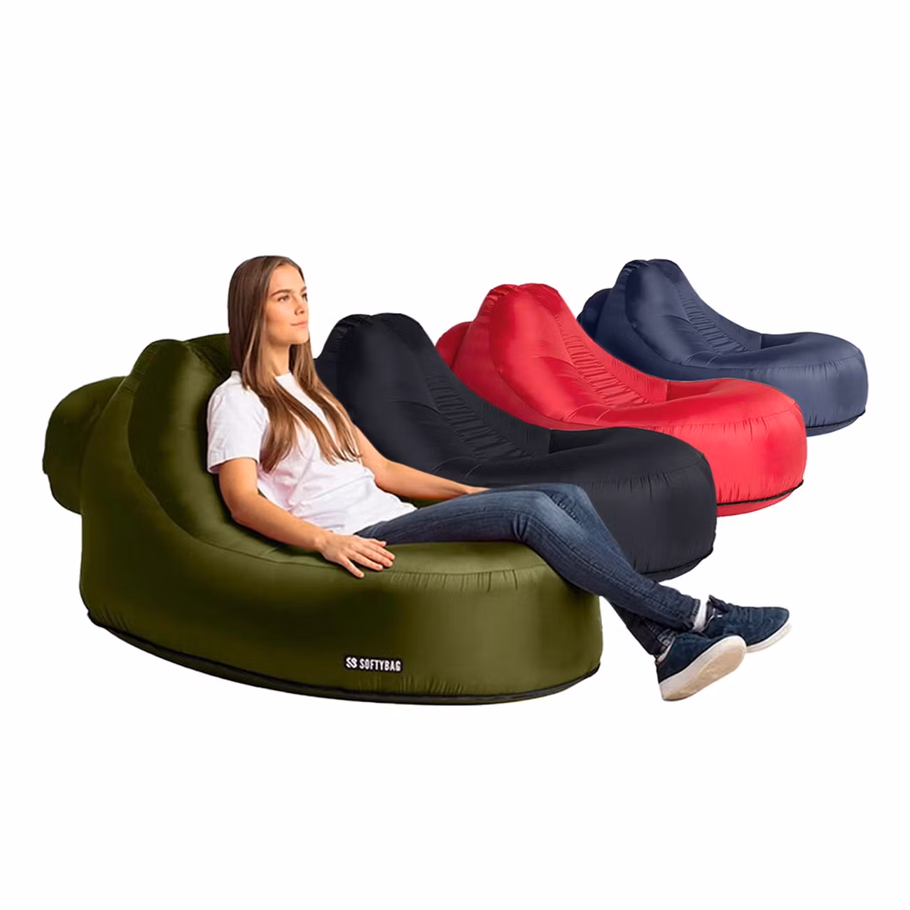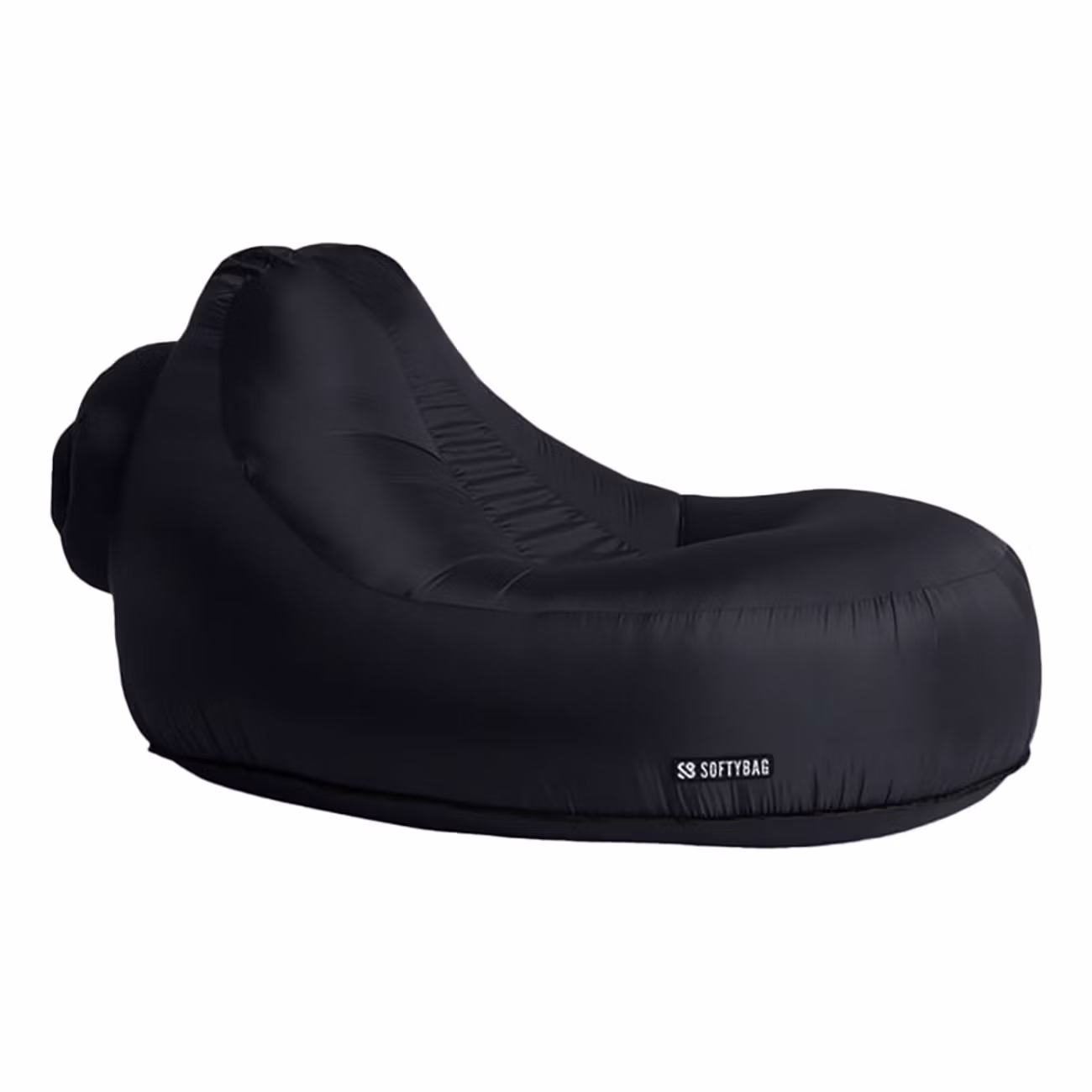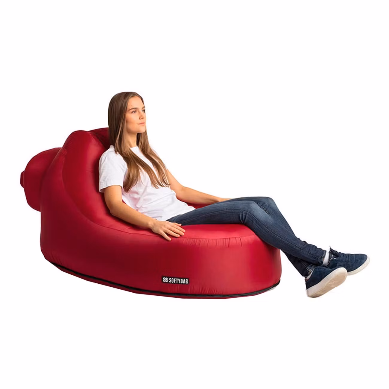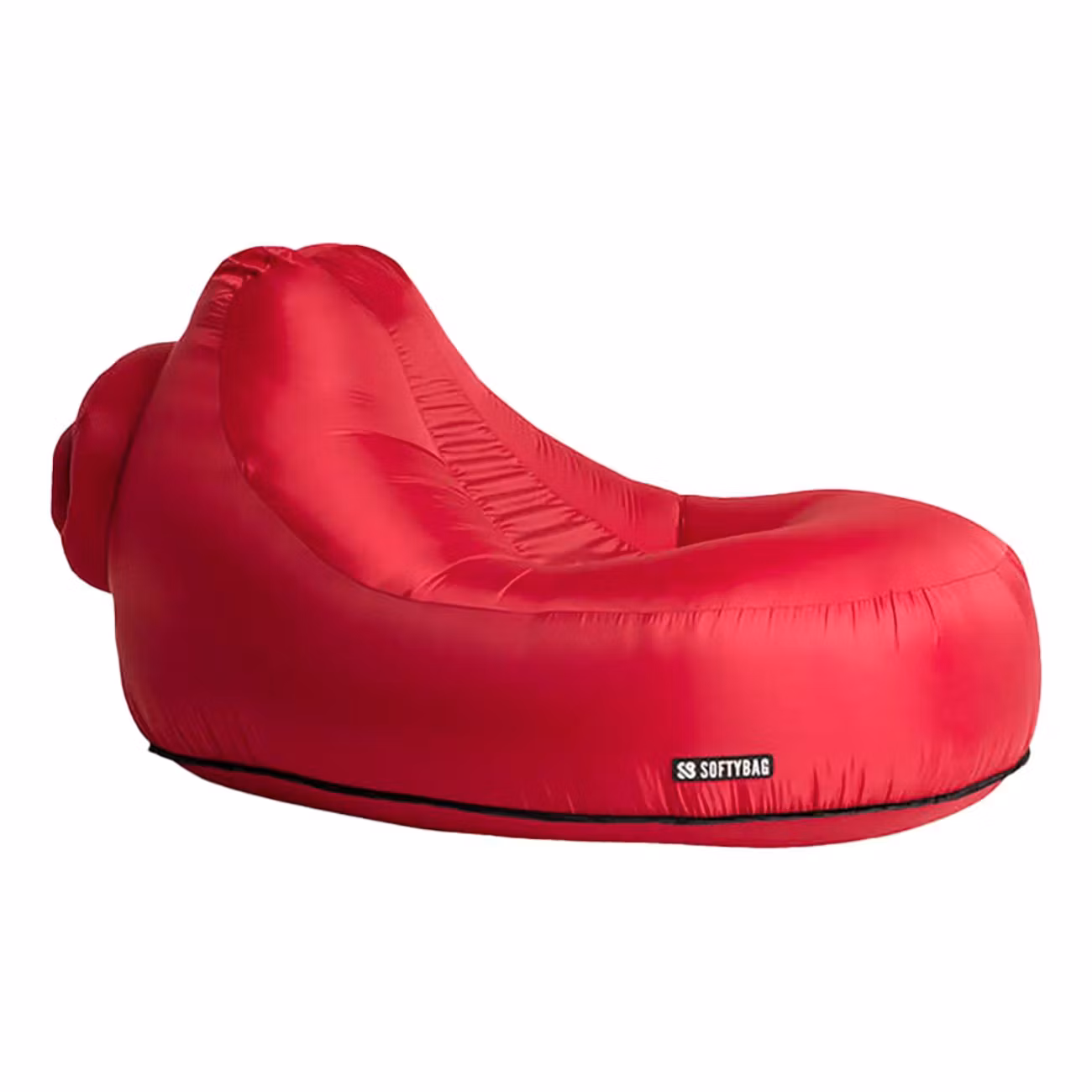 Softybag Uppblåsbar Fåtölj fylls med luft via ”Air Scooping Method”. Ta tag i bagen vid öppningen, öppna upp och svep i rak linje genom luften. Upprepa tre-fyra gånger eller tills påsen är cirka 70 % fylld. Rulla upp den stängda öppningen tills du inte kan rulla längre och stäng spännet.