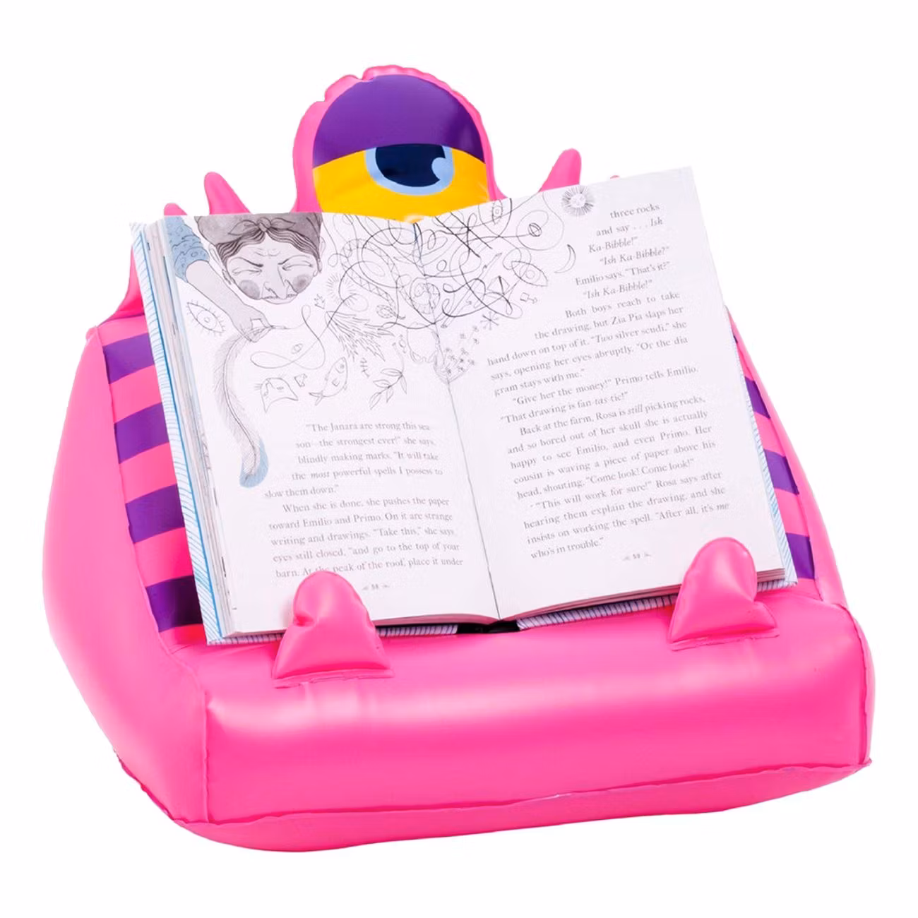 Uppblåsbar Bokhållare Monster Rosa är en uppblåsbar bokhållare som håller upp din bok eller Ipad. Passar perfekt att ha med till stranden, när du reser eller hemma i soffan!
