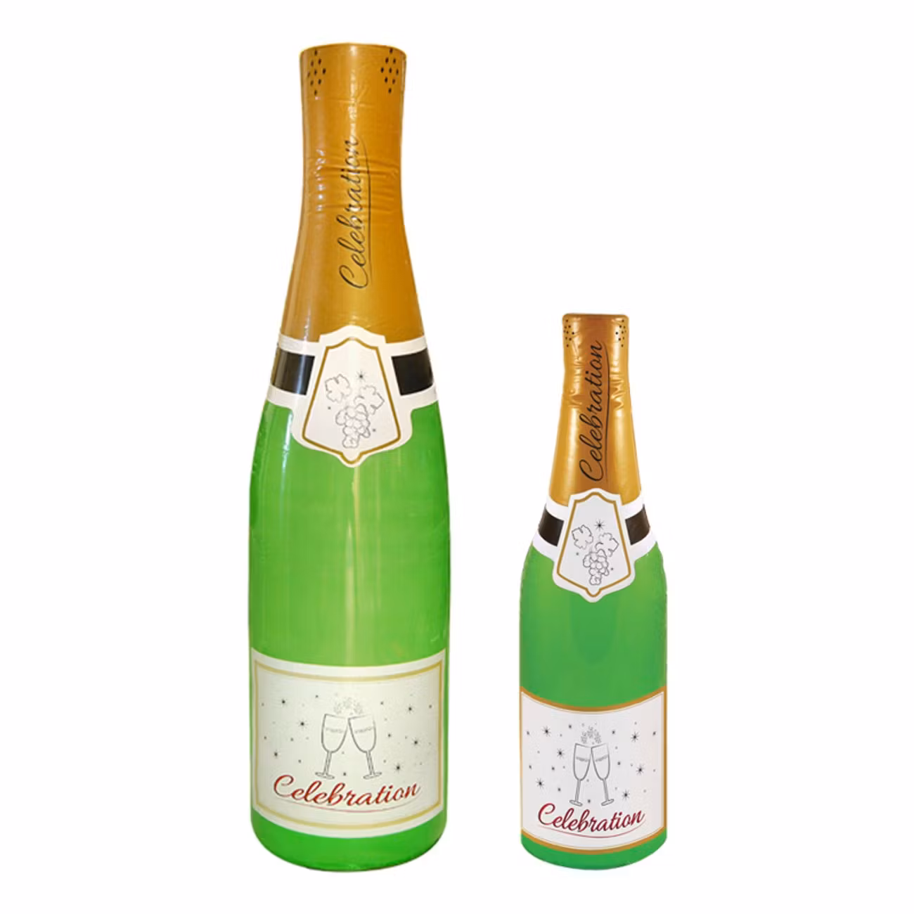 De uppblåsbara champagneflaskorna finns i två olika storlekar, en som är 73 cm lång och en större som mäter hela 180 cm hög.