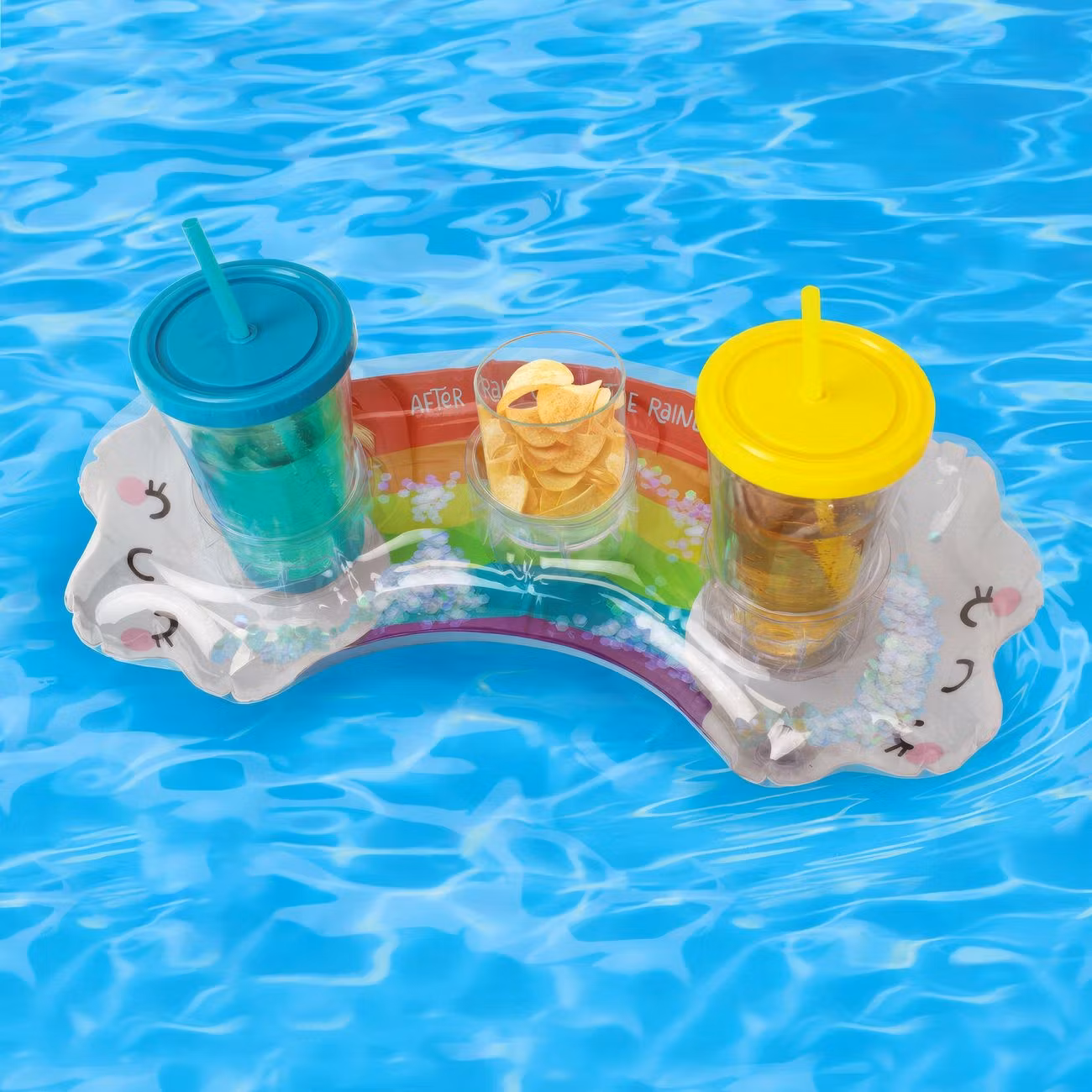 Uppblåsbar Drinkhållare Regnbåge är tänkt att ha i poolen, havet eller sjön och hjälper dig att hålla ordning på drinken. Den är uppblåsbar och kommer i formen av en färgglad regnbåge med glitter i. Drinkhållaren har plats för tre burkar.