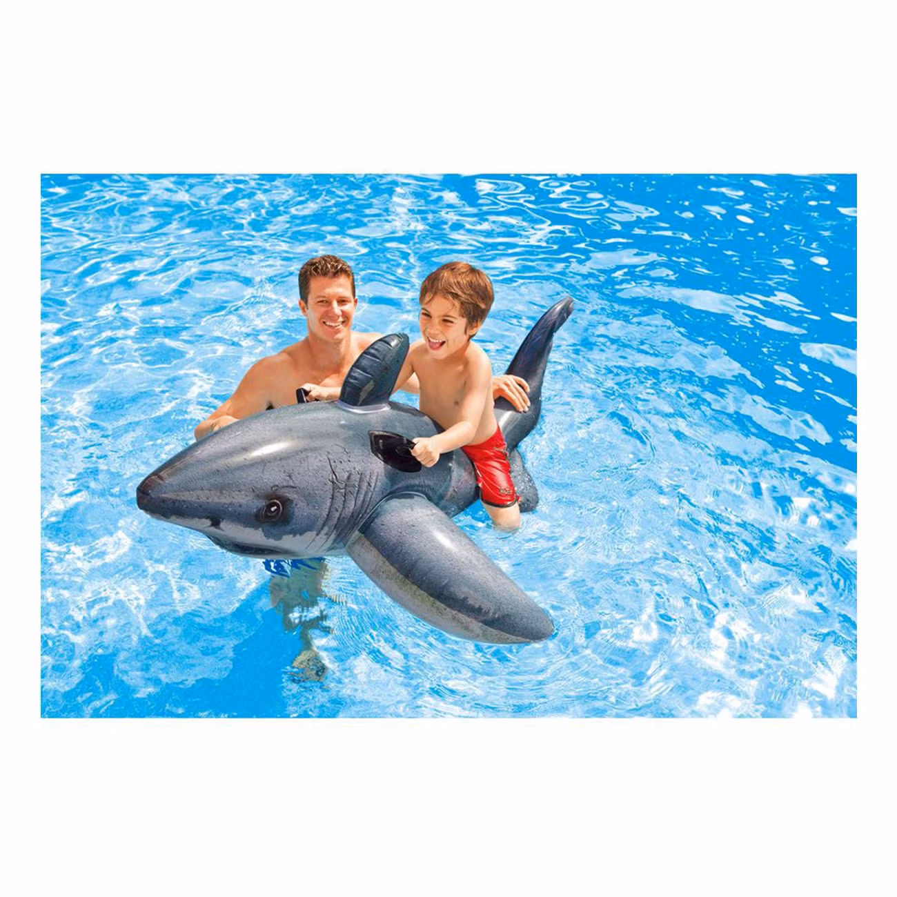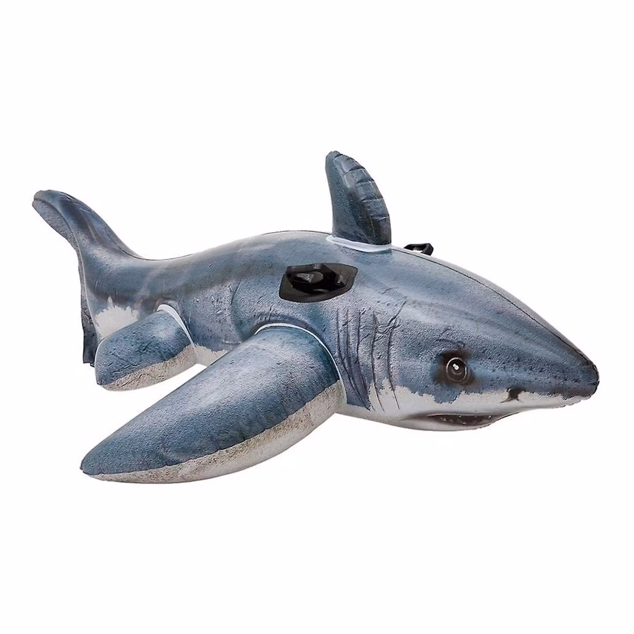 Uppblåsbar Vithaj Badmadrass levereras styckvis och är tillverkad i slittåligt PVC. Vithajen är riktigt stor, vilket gör den riktigt rolig för barn att använda. På vithajens rygg finns två stycken plasthållare som du kan använda om det blir vågigt i poolen.