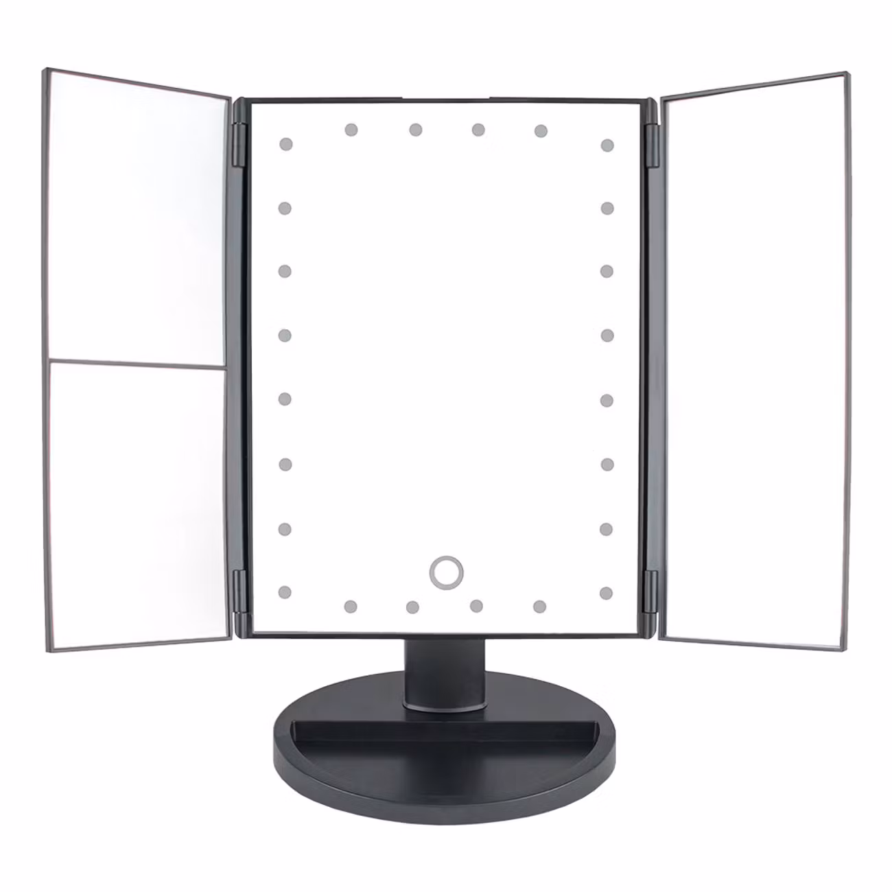 Hopfällbar Touchscreen LED Sminkspegel är en smart och praktisk spegel som är ihopfällbar och har inbyggd belysning samt speglar med 1x, 2x och 3x förstoring. Lamporna drivs av 4 st AA-batterier (medföljer ej).